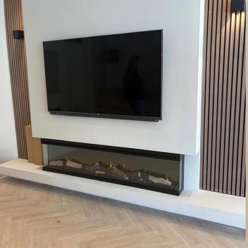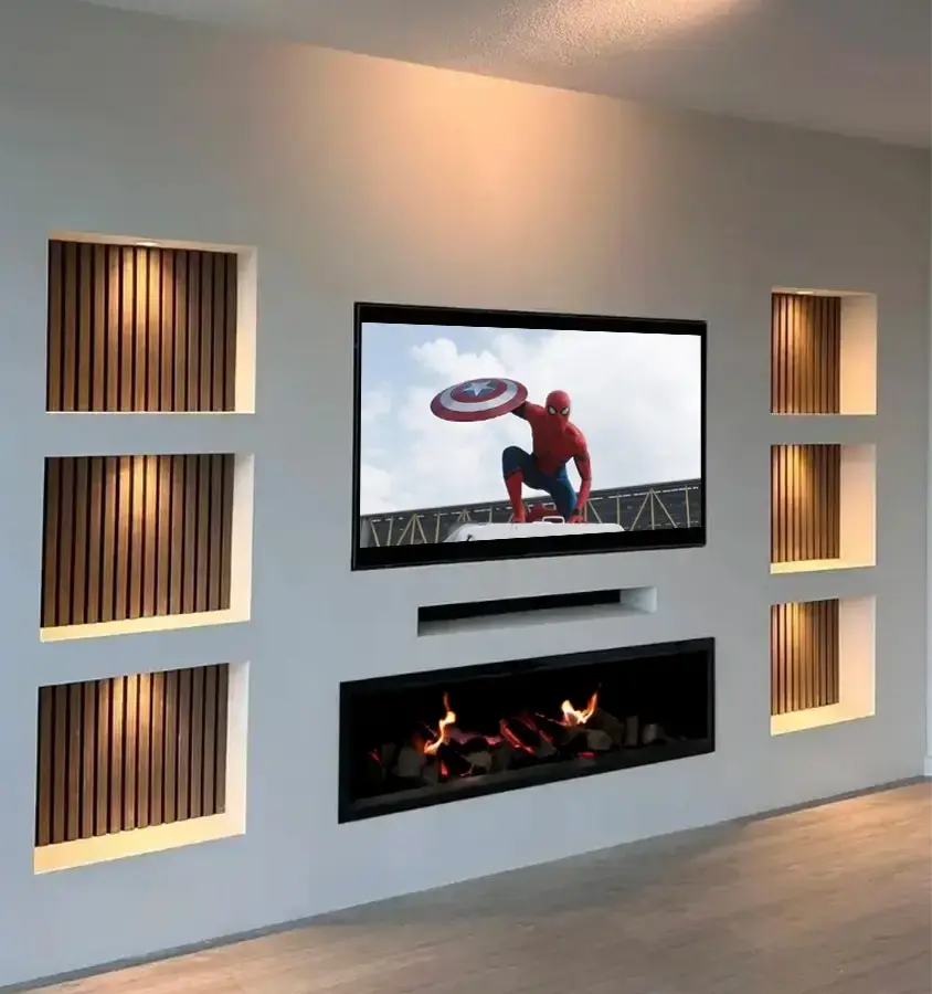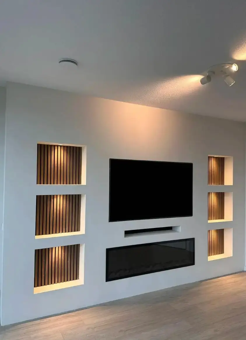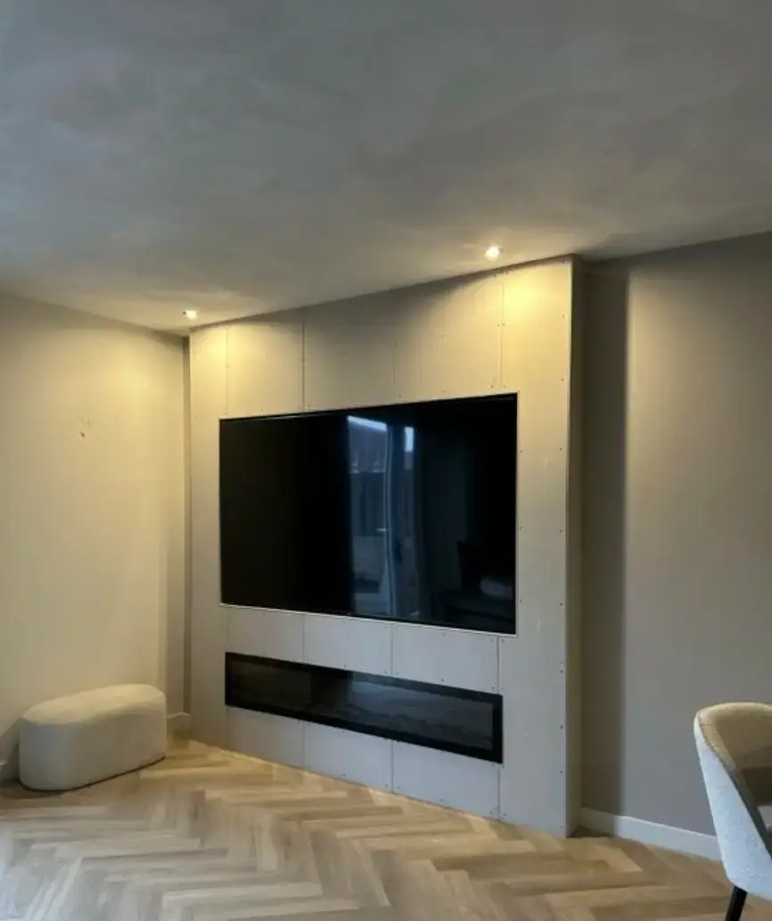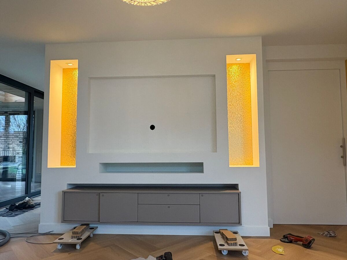 TV-wand op maat met nissen, verlichting, kabelmanagement en ventilatie; rust in beeld, techniek onzichtbaar.