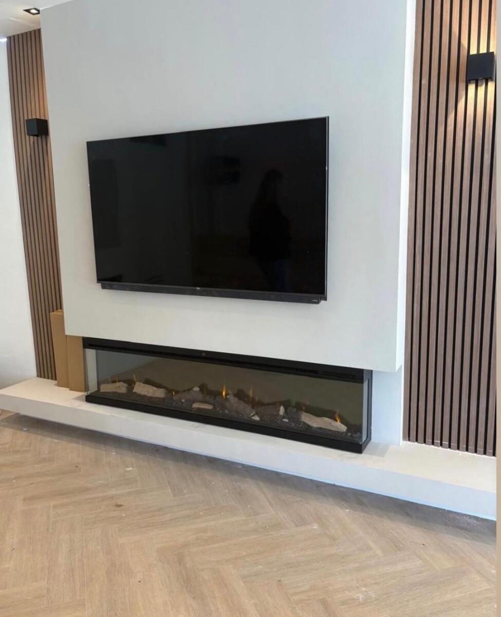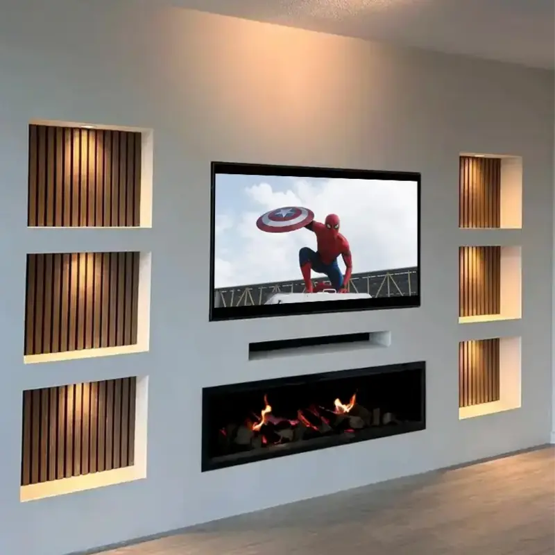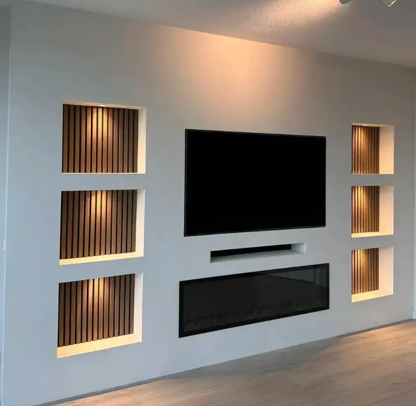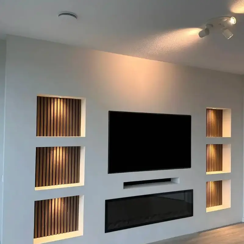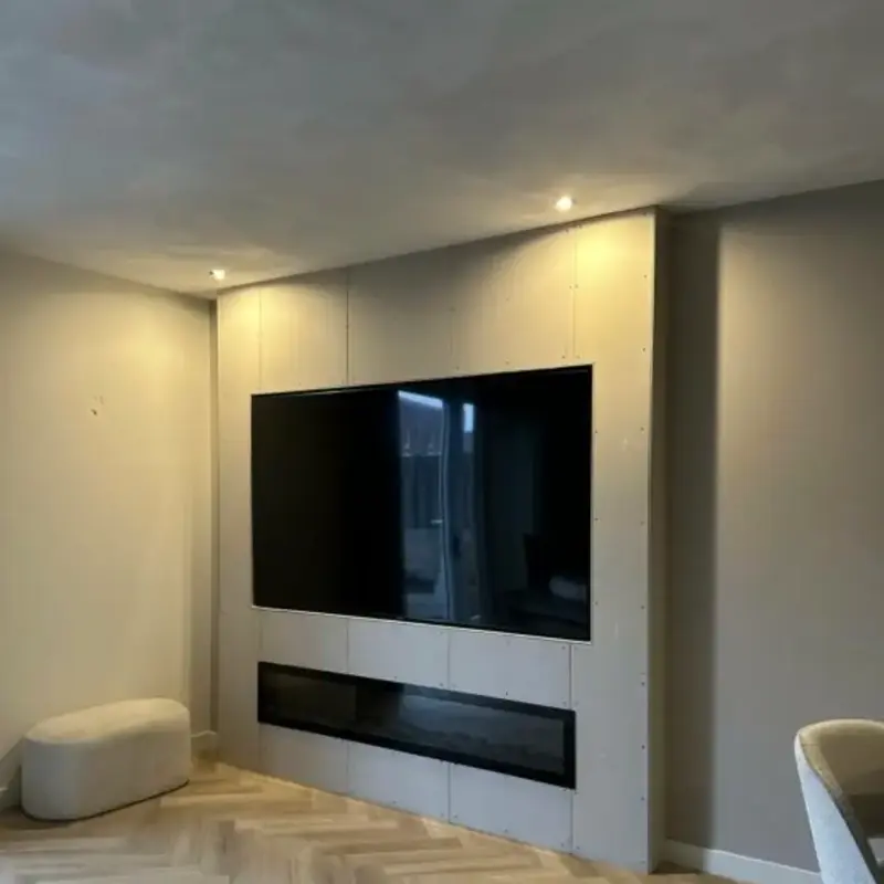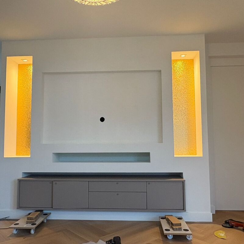 TV-wand op maat met nissen, verlichting, kabelmanagement en ventilatie; rust in beeld, techniek onzichtbaar.
